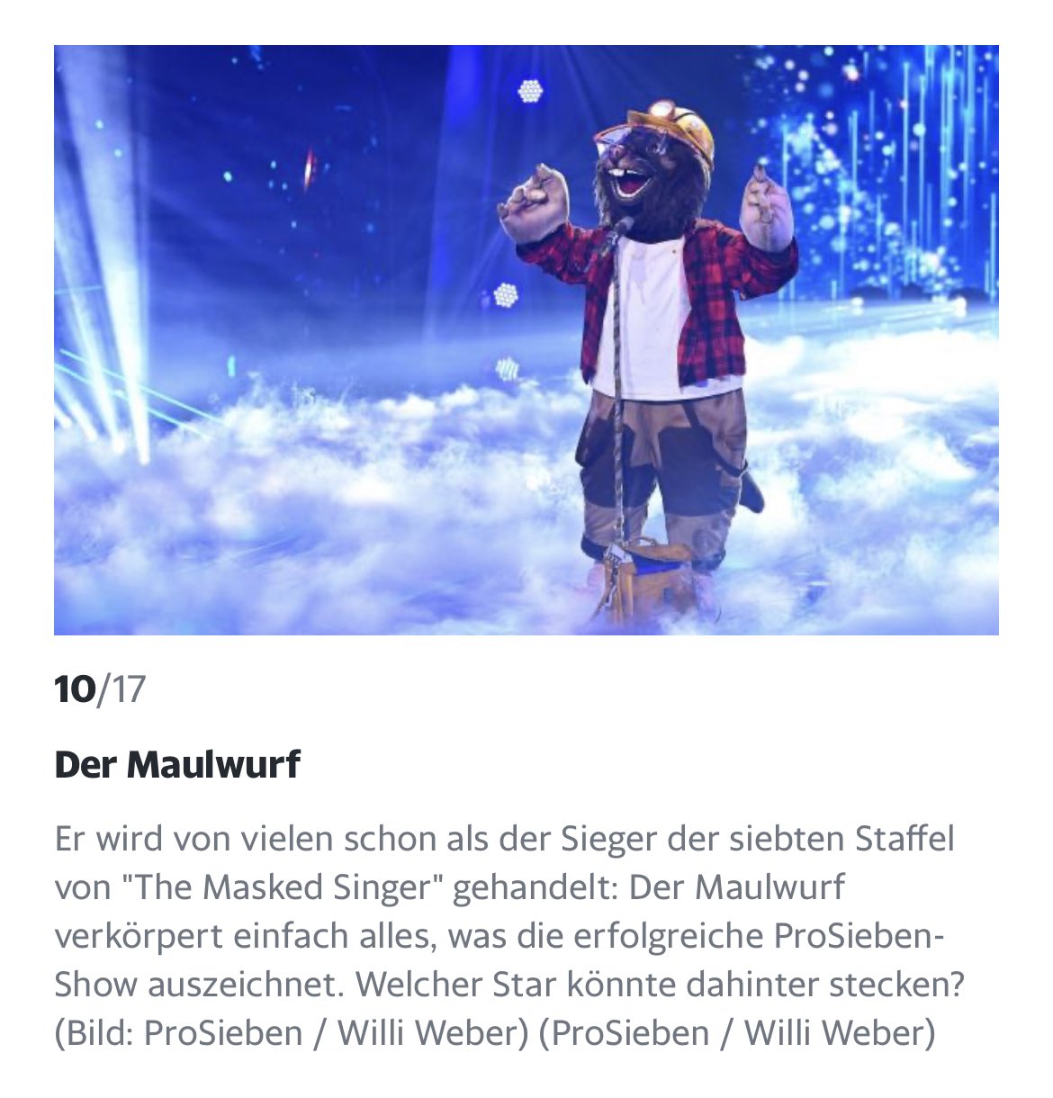 . Der Maulwurf hat sich Woche für Woche durchgesetzt. Season 8 airing now. Er gewann die siebte Staffel von The Masked Singer.
